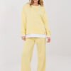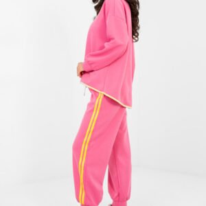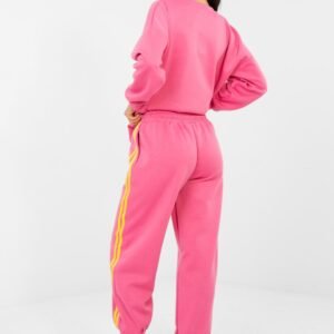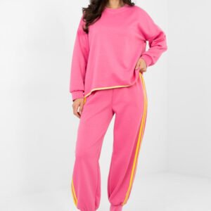 Stylowy komplet dresowy składający się z bluzy i spodni to idealna propozycja na co dzień dla osób ceniących wygodę w modnym wydaniu. Wykonany z wysokiej jakości mieszanki poliestru, wiskozy i elastanu, materiał jest miękki, elastyczny i przyjemny w dotyku, zapewniając komfort noszenia przez cały dzień. Bluza o klasycznym, okrągłym dekolcie i długim rękawie doskonale wpisuje się w casualowy styl. Gładki wzór nadaje całości uniwersalnego charakteru, dzięki czemu komplet łatwo dopasować do różnych dodatków. Spodnie z wysokim stanem posiadają w pasie praktyczne wiązanie, które umożliwia indywidualne dopasowanie. Model z długimi nogawkami zakończonymi ściągaczami zapewnia wygodę oraz sportowy wygląd. Boczne, wsuwane kieszenie zwiększają funkcjonalność, a modne lampasy po bokach nogawek dodają całości dynamicznego i nowoczesnego akcentu. To doskonały wybór na codzienne wyjścia, spacer czy relaks w domowym zaciszu połączenie komfortu i stylu w jednym zestawie.