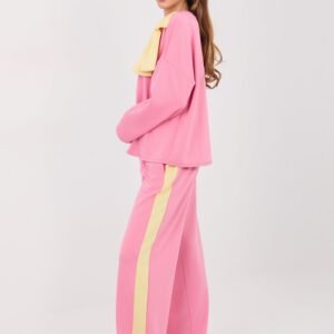 Stylowy komplet dresowy damski w casualowym wydaniu to idealna propozycja na co dzień. Połączenie komfortu z modnymi detalami sprawia, że zestaw doskonale sprawdzi się podczas codziennych aktywności, spacerów czy spotkań w swobodnym stylu. Komplet składa się z bluzy z długim rękawem i klasycznym, okrągłym dekoltem oraz długich spodni z szerokimi nogawkami. Gładki wzór podkreśla uniwersalny charakter zestawu, dzięki czemu łatwo dopasować go do różnych dodatków. Bluza została ozdobiona efektowną kontrastową kokardą na przodzie, która dodaje całości kobiecego i subtelnie eleganckiego akcentu. Spodnie z wysokim stanem pięknie modelują talię, a wszyta w pasie elastyczna guma zapewnia wygodne dopasowanie do sylwetki. Dodatkowym atutem są praktyczne boczne kieszenie wsuwane oraz lampasy biegnące wzdłuż nogawek, które nadają sportowego charakteru i optycznie wysmuklają nogi. Zestaw wykonany jest z przyjemnej w dotyku mieszanki poliestru, wiskozy i elastanu materiał jest miękki, elastyczny i odporny na zagniecenia, co gwarantuje komfort noszenia przez cały dzień. To wygodny i kobiecy komplet, który łączy sportową swobodę z modnymi detalami.