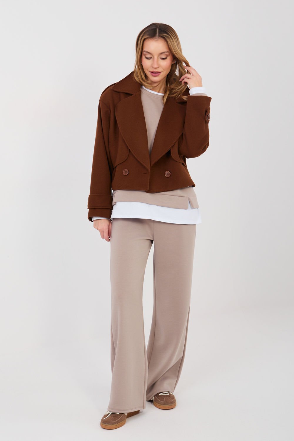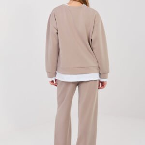 Komplet dresowy w stylu casual to doskonały wybór na co dzień dla kobiet ceniących wygodę i nowoczesny minimalizm. Gładki wzór podkreśla uniwersalny charakter zestawu, dzięki czemu świetnie sprawdzi się zarówno podczas codziennych wyjść, jak i w domowym zaciszu. Wykonany z wysokiej jakości mieszanki poliestru, wiskozy i elastanu, komplet zapewnia komfort noszenia, elastyczność oraz przyjemne dopasowanie do sylwetki. Materiał jest miękki, trwały i odporny na zagniecenia, co sprawia, że zestaw zachowuje estetyczny wygląd przez długi czas. Bluza z długim rękawem została wykończona kontrastowymi wstawkami, które nadają całości modowego charakteru. Dodatkowym akcentem jest naszywka umieszczona na przodzie, po lewej stronie u dołu, podkreślająca nowoczesny styl kompletu. Spodnie o długiej długości z prostymi nogawkami i wysokim stanem pięknie modelują sylwetkę oraz zapewniają wygodę noszenia. W pasie znajdują się troczki do wiązania, umożliwiające idealne dopasowanie, a boczne kieszenie wsuwane zwiększają funkcjonalność zestawu. To stylowy i praktyczny komplet, który łączy komfort z ponadczasową prostotą.