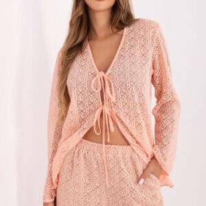 Ażurowy komplet damski składający się z koszuli i szortów to idealna propozycja na codzienne, letnie stylizacje w stylu casual. Wykonany z przyjemnej w dotyku mieszanki bawełny, elastanu i poliestru, zapewnia komfort noszenia oraz swobodę ruchów. Koszula z długim rękawem i dekoltem w serek zapinana jest w formie stylowego wiązania, co dodaje lekkości i nowoczesnego charakteru całemu zestawowi. Szorty o szerokich nogawkach i wysokim stanie zostały wyposażone w praktyczne, boczne kieszenie wsuwane oraz wygodną podszewkę, zapewniającą komfort i dyskrecję. Ażurowy wzór nadaje kompletowi subtelnego uroku, czyniąc go doskonałym wyborem na ciepłe dni zarówno na spacer, jak i spotkanie z przyjaciółmi.