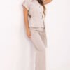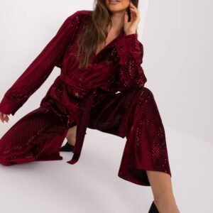 Komplet elegancki składający się z koszuli i spodni to doskonały wybór na wyjątkowe okazje, takie jak imprezy czy wydarzenia wizytowe. Ta stylizacja emanuje luksusem i dbałością o detale, doskonale sprawdzając się w sytuacjach, gdzie elegancja jest kluczowa. Koszula, zapinana na guziki, prezentuje się niezwykle schludnie i klasycznie. Jej fason podkreśla sylwetkę, a wysoki kołnierzyk dodaje szyku. Długi rękaw sprawia, że komplet nadaje się również na chłodniejsze wieczory. Spodnie posiadają proste nogawki i wysoki stan, co nadaje im elegancki charakter. Długość standardowa sprawia, że są uniwersalne i pasują do różnych okazji. Dodatkowym elementem ozdobnym są wsuwane kieszenie boczne, które jednocześnie nadają spodniom funkcjonalność. Wzór dominujący to subtelne aplikacje w postaci cekinów, które dodają zestawowi blasku i wyjątkowości. Pasek do wiązania, będący częścią kompletnego zestawu, podkreśla talię, nadając całości eleganckiego wykończenia. Ten elegancki komplet sprawdzi się doskonale na imprezy czy wizytowe okazje, prezentując noszącą w sposób wyjątkowo stylowy i zmysłowy. To połączenie klasycznej elegancji z subtelnym akcentem modowej świeżości.