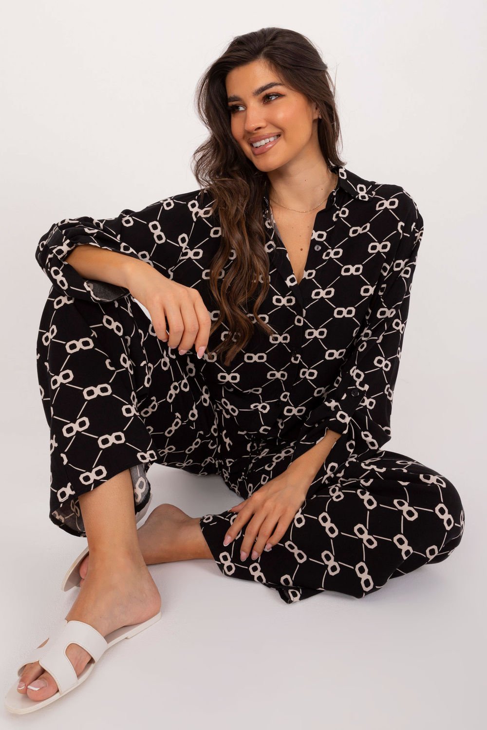 Odkryj letni komplet damski, który składa się z eleganckiej koszuli i wygodnych spodni. Ten zestaw jest idealnym wyborem na codzienne wyjścia, oferując połączenie komfortu i stylu. Elegancka koszula zapinana na guziki, co ułatwia jej zakładanie i zdejmowanie. Dodatkowy pasek do wiązania w talii, który podkreśla sylwetkę i dodaje uroku. Koszula posiada długie rękawy, co sprawia, że jest odpowiednia na chłodniejsze dni. Klasyczny kołnierzyk dodaje koszuli formalnego charakteru, który doskonale balansuje z jej casualowym stylem. Spodnie wyposażone są w wiązanie w pasie, które pozwala na idealne dopasowanie do sylwetki. Proste nogawki sprawiają, że spodnie są uniwersalne i pasują do wielu stylizacji. Wysoki stan zapewnia komfort i podkreśla talię. Praktyczne, wsuwane kieszenie boczne dodają funkcjonalności i wygody. Komplet zdobiony jest oryginalnym nadrukiem, który przyciąga wzrok i dodaje świeżości każdej stylizacji.