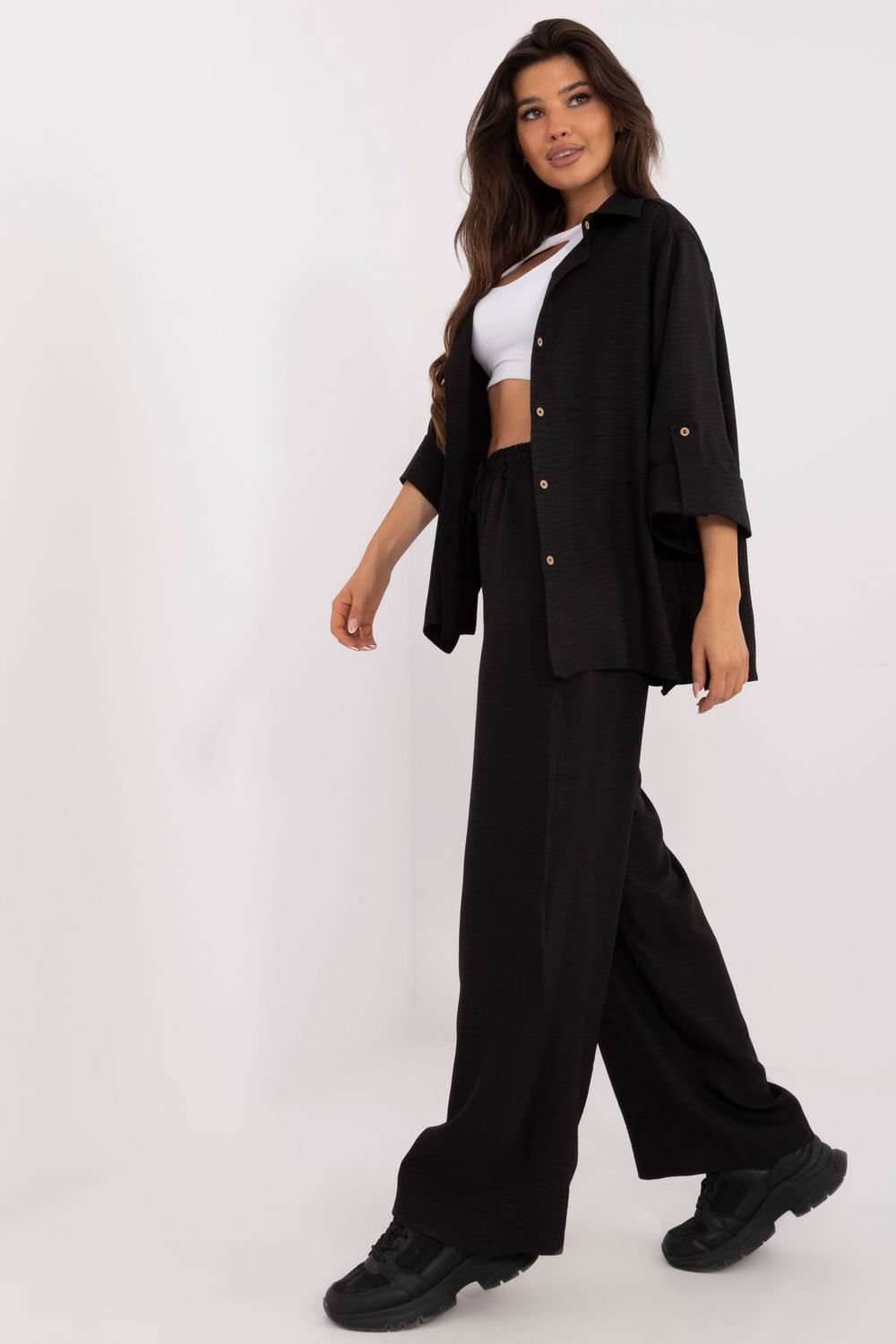 Stylowy i wygodny komplet, idealny na co dzień dla kobiet ceniących komfort i elegancki casualowy look. Wykonany z wysokiej jakości mieszanki bawełny i poliestru, zapewnia przewiewność, miękkość i wygodę przez cały dzień. Koszula o klasycznym kroju z kołnierzykiem i rękawem 3/4 zapinana jest na guziki, co nadaje jej ponadczasowego charakteru. Szerokie spodnie z wysokim stanem pięknie podkreślają sylwetkę, a wiązanie w pasie pozwala na idealne dopasowanie do figury. Wsuwane boczne kieszenie dodają praktyczności i swobodnego wyglądu. Gładki wzór i minimalistyczny design sprawiają, że komplet można łatwo zestawić z różnymi dodatkami, tworząc stylizacje na wiele okazji. To doskonały wybór dla kobiet, które lubią połączenie wygody i modnego wyglądu!