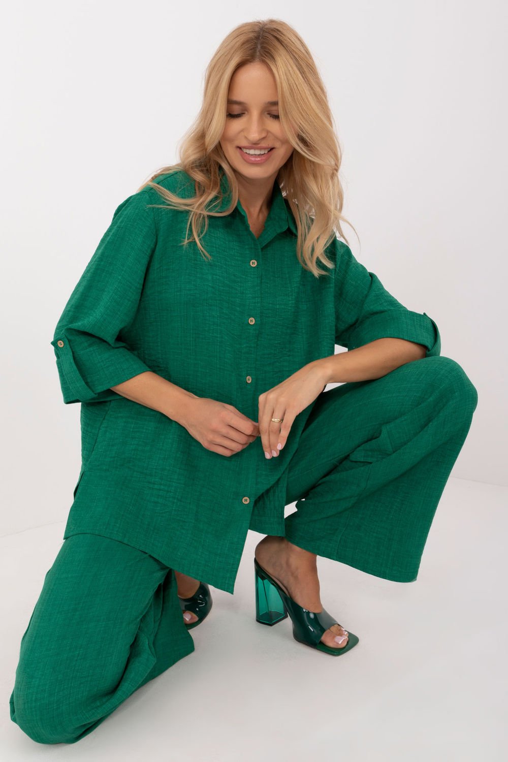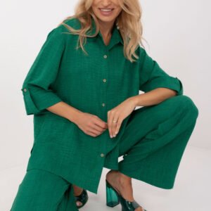 Stylowy i wygodny komplet, idealny na co dzień dla kobiet ceniących komfort i elegancki casualowy look. Wykonany z wysokiej jakości mieszanki bawełny i poliestru, zapewnia przewiewność, miękkość i wygodę przez cały dzień. Koszula o klasycznym kroju z kołnierzykiem i rękawem 3/4 zapinana jest na guziki, co nadaje jej ponadczasowego charakteru. Szerokie spodnie z wysokim stanem pięknie podkreślają sylwetkę, a wiązanie w pasie pozwala na idealne dopasowanie do figury. Wsuwane boczne kieszenie dodają praktyczności i swobodnego wyglądu. Gładki wzór i minimalistyczny design sprawiają, że komplet można łatwo zestawić z różnymi dodatkami, tworząc stylizacje na wiele okazji. To doskonały wybór dla kobiet, które lubią połączenie wygody i modnego wyglądu!