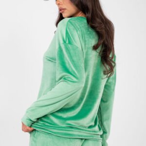 Damski komplet welurowy składający się z bluzy i spodni, wykonany z miękkiej i przyjemnej w dotyku tkaniny z bawełny i poliestru. Bluza o klasycznym kroju z długimi rękawami i okrągłym dekoltem, idealna do codziennych, casualowych stylizacji. Spodnie z prostymi, długimi nogawkami o wysokim stanie, wyposażone w praktyczne wsuwane kieszenie boczne. Całość uzupełniają troczki do wiązania z delikatnymi cyrkoniami, dodające kompletnemu zestawowi subtelnego, eleganckiego blasku. Gładki wzór i komfortowy fason sprawiają, że komplet świetnie sprawdzi się na co dzień i w domowym relaksie.