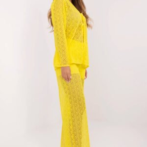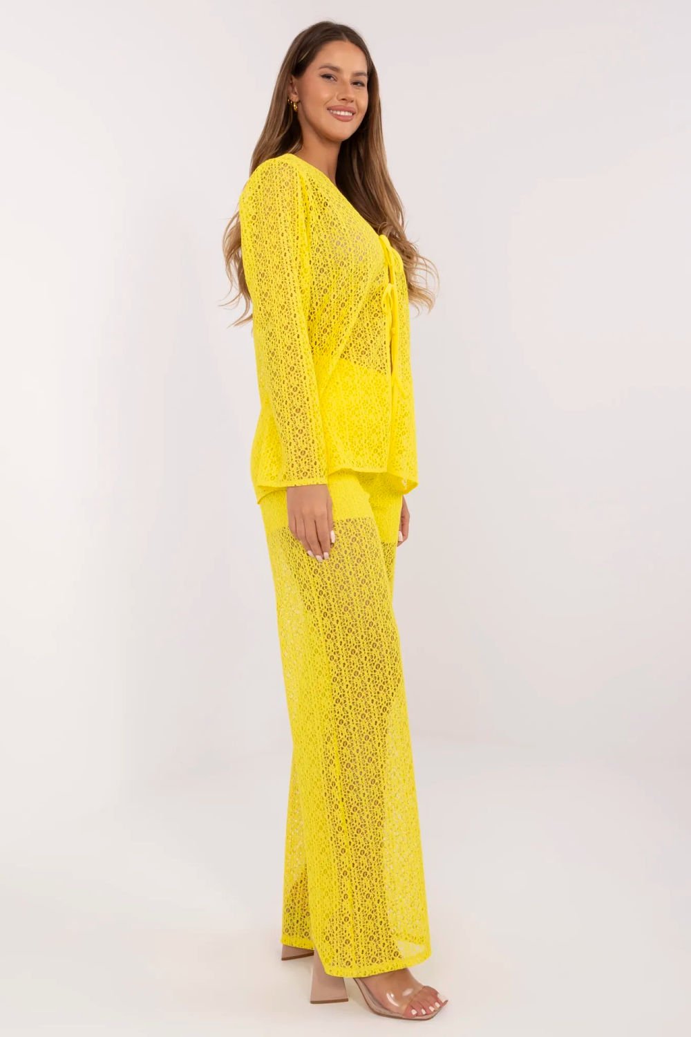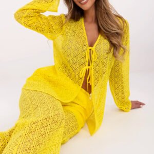 Stylowy i wygodny ażurowy komplet damski to doskonały wybór na co dzień dla kobiet ceniących modowy wygląd i komfort. Wykonany z przewiewnej mieszanki bawełny, elastanu i poliestru, zapewnia wygodę i doskonałe dopasowanie. Koszula z długim rękawem i wiązaniem na przodzie zamiast guzików dodaje stylizacji lekkości i subtelnej elegancji. Spodnie o prostym kroju i wysokim stanie wysmuklają sylwetkę, a wsuwane boczne kieszenie dodają funkcjonalności. Dodatkowo górna część spodni została wyposażona w podszewkę, zapewniając komfort noszenia. Ażurowy wzór nadaje całości unikalnego, kobiecego charakteru, idealnie wpisując się w casualowe stylizacje. Komplet świetnie sprawdzi się zarówno w codziennych zestawach, jak i w lekkich, letnich lookach.