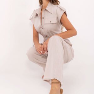 Stylowy damski komplet składający się z koszuli i spodni to idealne połączenie wygody i elegancji w codziennym wydaniu. Uszyty z przewiewnej mieszanki wiskozy i lnu, zapewnia komfort noszenia nawet w cieplejsze dni. Gładki materiał oraz klasyczny kołnierzyk nadają zestawowi ponadczasowy, schludny wygląd. Koszula zapinana na guziki posiada krótki rękaw oraz praktyczną kieszeń na wysokości piersi. Dodatkowy pasek do wiązania w talii pozwala dopasować fason do sylwetki i podkreślić kobiece kształty. Spodnie z prostą nogawką, wiązaniem w pasie i wysokim stanem wyposażone są w boczne, wsuwane kieszenie, co zwiększa funkcjonalność kompletu. Doskonały wybór na co dzień oraz do pracy lekki, wygodny i stylowy.