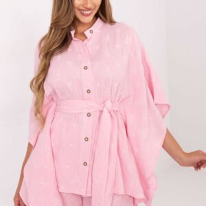 Zestaw składający się z koszuli i krótkich szortów to idealna propozycja na codzienne, komfortowe stylizacje. Wykonany z naturalnej, przewiewnej bawełny muślinowej z delikatnym haftem na materiale, który dodaje całości subtelnej elegancji. Koszula zapinana na guziki, z wygodnym paskiem do wiązania w talii, posiada rękaw 3/4 oraz stylową stójkę przy dekolcie, co nadaje jej lekkości i nowoczesnego charakteru. Szorty o prostym kroju i wysokim stanie wyposażone są w praktyczne, boczne wsuwane kieszenie, a w pasie mają wygodną gumę, która gwarantuje idealne dopasowanie. Całość tworzy spójny i wygodny komplet, doskonały na letnie dni i codzienne okazje.