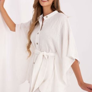 Zestaw składający się z koszuli i krótkich szortów to idealna propozycja na codzienne, komfortowe stylizacje. Wykonany z naturalnej, przewiewnej bawełny muślinowej z delikatnym haftem na materiale, który dodaje całości subtelnej elegancji. Koszula zapinana na guziki, z wygodnym paskiem do wiązania w talii, posiada rękaw 3/4 oraz stylową stójkę przy dekolcie, co nadaje jej lekkości i nowoczesnego charakteru. Szorty o prostym kroju i wysokim stanie wyposażone są w praktyczne, boczne wsuwane kieszenie, a w pasie mają wygodną gumę, która gwarantuje idealne dopasowanie. Całość tworzy spójny i wygodny komplet, doskonały na letnie dni i codzienne okazje.