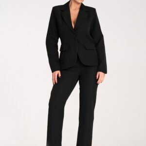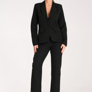 Elegancki komplet damski. Klasyczna marynarka zapinana na jeden guzik i dopasowane spodnie z wysokim stanem oraz kieszeniami.