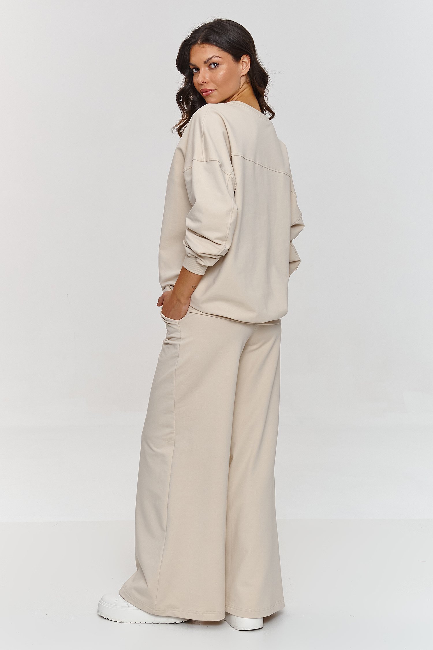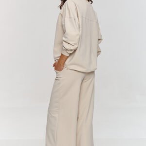 Ten komplet dresowy to idealny wybór dla kobiet, które cenią funkcjonalność i styl. Zestaw składa się z oversizowej bluzy z długimi rękawami oraz luźnych spodni, które tworzą komfortową, ale stylową całość. Dzięki szerokiemu krojowi, spodnie zapewniają pełną swobodę ruchów, a elastyczny pas dopasowuje się do sylwetki. Dodatkowo są poszerzane ku dołowi nadając zestawowi wyjątkowy i dynamiczny charakter. Bluza z klasycznym okrągłym dekoltem i rękawami zakończonymi ściągaczami dopełnia całość, tworząc wygodny i ciekawy komplet. Dres wykonany z miękkiego i przyjemnego w dotyku materiału dresowego, który zapewnia komfort każdego dnia. Dzięki prostemu, ale efektownemu krojowi, zestaw świetnie sprawdzi się w różnych sytuacjach. Nasz komplet dresowy to wybór, który łączy luz, funkcjonalność i nowoczesny wygląd. Sprawdzi się zarówno na relaks w domu, jak i na spotkania z przyjaciółmi, zakupy czy na co dzień. Zestaw idealnie komponuje się z ulubionymi sneakersami, tworząc stylową, wygodną i modową stylizację.