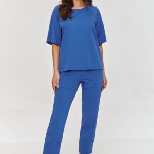 Ten wygodny komplet dresowy to idealna propozycja na codzienne stylizacje i aktywny wypoczynek. Posiada luźną bluzkę z okrągłym dekoltem wykończonym delikatnym ściągaczem oraz reglanowymi rękawami doskonałymi dla osób chcących skorygować linię ramion. Klasyczne spodnie z prostymi nogawkami mają wszyty w pasie ściągacz, który pozwala na dopasowanie się do sylwetki a duże naszyte kieszenie dodają stylowego akcentu i funkcjonalności. Takie połączenie elementów garderoby tworzy harmonijną i wygodną całość. Prosty i luźny krój tego zestawu sprawia, że jest ponadczasowy i uniwersalny zachowując przy tym swobodę i modny wygląd. Dresowy komplet wykonany jest z przewiewnego, bawełnianego materiału, który czyni go praktycznym nawet podczas cieplejszych dni. Taki zestaw idealnie sprawdzi się na codzienne wyjścia, zakupy, spotkania z przyjaciółmi czy inne aktywności fizyczne. Ten dres to połączenie funkcjonalności i stylu, idealne dla osób, które chcą czuć się wygodnie, nie rezygnując przy tym z modnego wyglądu.