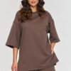 Ten wygodny komplet dresowy to idealna propozycja na codzienne stylizacje i aktywny wypoczynek. Posiada luźną bluzkę z okrągłym dekoltem wykończonym delikatnym ściągaczem oraz reglanowymi rękawami doskonałymi dla osób chcących skorygować linię ramion. Klasyczne spodnie z prostymi nogawkami mają wszyty w pasie ściągacz, który pozwala na dopasowanie się do sylwetki a duże naszyte kieszenie dodają stylowego akcentu i funkcjonalności. Takie połączenie elementów garderoby tworzy harmonijną i wygodną całość. Prosty i luźny krój tego zestawu sprawia, że jest ponadczasowy i uniwersalny zachowując przy tym swobodę i modny wygląd. Dresowy komplet wykonany jest z przewiewnego, bawełnianego materiału, który czyni go praktycznym nawet podczas cieplejszych dni. Taki zestaw idealnie sprawdzi się na codzienne wyjścia, zakupy, spotkania z przyjaciółmi czy inne aktywności fizyczne. Ten dres to połączenie funkcjonalności i stylu, idealne dla osób, które chcą czuć się wygodnie, nie rezygnując przy tym z modnego wyglądu.