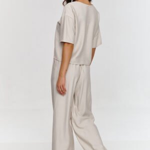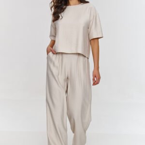 Ten elegancki komplet to idealna propozycja na wiosenne i letnie dni, kiedy chcesz połączyć modny wygląd z wysoką jakością wykonania. Zestaw posiada luźną bluzkę o pudełkowym kroju, który idealnie pasuje do eleganckich stylizacji. Krótki rękaw i prosty fason bluzki sprawiają, że jest to doskonała opcja na formalne i mniej formalne wyjścia, łącząc elegancję z wygodą. Spodnie wyróżniają się szerokimi nogawkami, które nadają stylizacji nowoczesny i elegancki wygląd. Elastyczny pas zapewnia komfort noszenia, a ich długość dodaje całości klasy i stylu. Model wykonany z delikatnego i lekkiego materiału imitującego len. Prosty, ale wysublimowany krój sprawia, że komplet ma ponadczasowy charakter, który będzie wyglądać stylowo na każdej sylwetce. Zestaw doskonale sprawdzi się na spotkania biznesowe, eleganckie wyjścia czy wypady do miasta, kiedy zależy Ci na połączeniu elegancji i swobody. Możesz go zestawić ze szpilkami, eleganckimi sandałami lub białymi sneakersami.