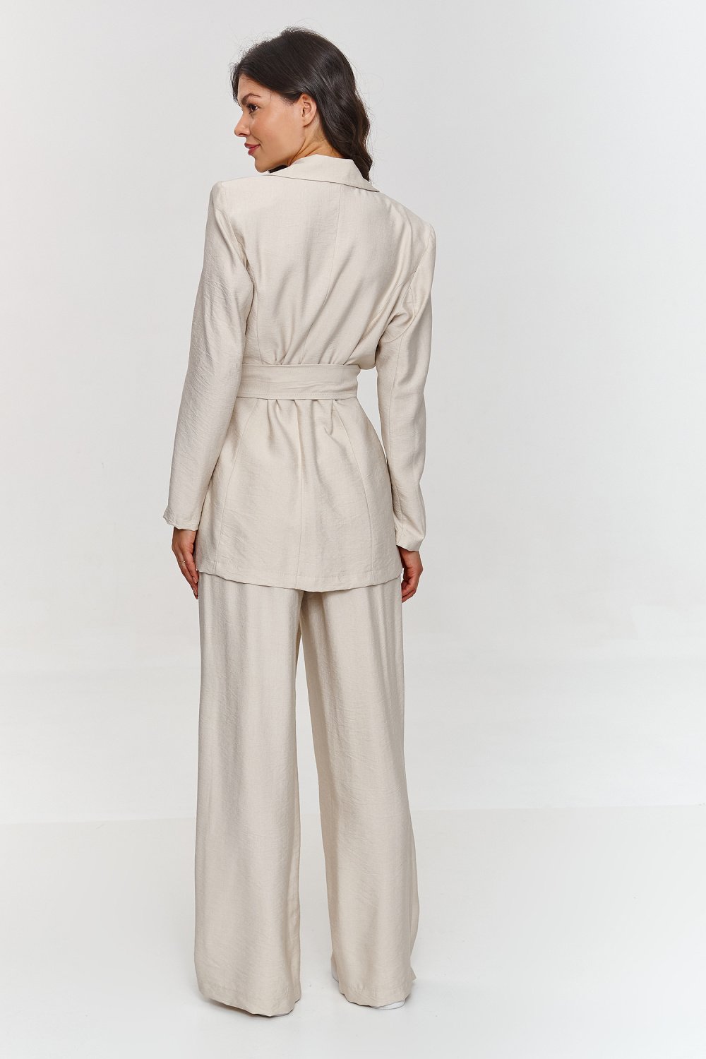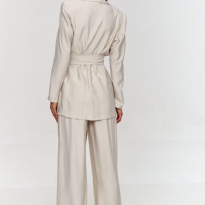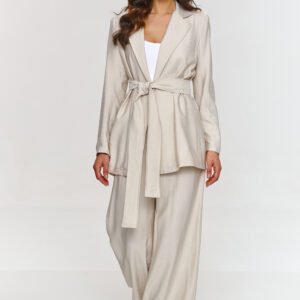 Ten damski komplet został zaprojektowany z myślą o kobietach, które szukają połączenia stylu, wygody i nowoczesnej elegancji. Marynarka o dłuższym luźnym kroju, nadaje stylizacji nowoczesny charakter a wiązany pasek pozwala na dopasowanie do sylwetki podkreślając linię talii. Nie posiada podszewki co czyni ją lżejszą i swobodniejszą. Spodnie o szerokich nogawkach podkreślają modny wygląd a elastyczny pas zapewnia maksymalny komfort. Model wykonany z lekkiego, strukturalnego materiału, który akcentuje jego wyjątkowość i klasę. Dodatkowym plusem jest możliwość noszenia każdego elementu oddzielnie tworząc różnorodne i oryginalne outfity. Dzięki prostej ale efektownej konstrukcji komplet jest doskonałym rozwiązaniem zarówno na wypady ze znajomymi jak i do biura, na spotkania biznesowe i inne formalne wyjścia gdzie chcesz wyglądać profesjonalnie jednocześnie nie rezygnując z wygody.