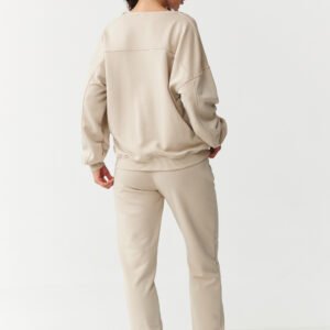 Stylowy komplet dresowy dla kobiet, który łączy nowoczesny design z wyjątkowym komfortem noszenia. Wykonany z wysokiej jakości dzianiny o składzie 95% bawełna i 5% elastan, zapewnia miękkość, elastyczność oraz idealne dopasowanie do sylwetki. To doskonały wybór na co dzień, sprawdzi się w domu, podczas spacerów, zakupów czy weekendowego relaksu. Głównym wyróżnikiem tego zestawu jest haftowana aplikacja z logo marki na przodzie bluzy, która dodaje mu oryginalnego charakteru i modowego wyrazu. Bluza ma luźniejszy krój z obniżoną linią ramion i zakończona jest wygodnymi ściągaczami przy rękawach i na dole, co nadaje jej casualowego stylu. Okrągły dekolt również wykończony subtelnym ściągaczem co podkreśla jego ponadczasowość. Spodnie wyposażone są w elastyczną talię oraz ściągacze przy nogawkach, dzięki czemu świetnie układają się na sylwetce i zapewniają wygodę przez cały dzień. Ten dres to idealne połączenie funkcjonalności i stylu. Sprawdzi się zarówno jako zestaw, jak i noszony osobno. Uniwersalny fason pasuje do wielu okazji i gwarantuje swobodę ruchów bez kompromisów. Postaw na jakość, wygodę i modny detal wybierz dres z haftowaną aplikacją, który podkreśli Twój styl każdego dnia!