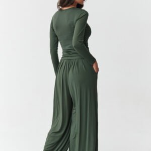 Ten komplet to idealna propozycja dla kobiet, które szukają połączenia wygody, stylu i delikatności. Wykonany z miękkiej, przyjemnej w dotyku wiskozy, idealnie dopasowuje się do sylwetki, zapewniając swobodę ruchów i wygodę przez cały dzień. Górę zestawu stanowi dopasowana bluzka z długim rękawem, która wyróżnia się subtelnym marszczeniem po bokach. Ten kobiecy detal nie tylko podkreśla talię, ale też nadaje całości eleganckiego, ale niezobowiązującego charakteru. To połączenie prostoty z modnym detalem sprawia, że bluzka świetnie sprawdzi się nie tylko jako część kompletu, ale również solo w wielu stylizacjach. Szerokie, luźno układające się spodnie to gwarancja wygody i stylu w jednym. Dzięki elastycznej talii i swobodnemu krojowi świetnie sprawdzają się w ruchu, a boczne kieszenie dodają im funkcjonalności. To idealny fason zarówno do noszenia w domu, jak i w streetowych stylizacjach. Zestaw damski dostępny jest w modnych, uniwersalnych kolorach: antracytowy, czarny, czekoladowy, khaki oraz bordowy. Postaw na komfort, który idzie w parze z kobiecym wyglądem wybierz komplet z wiskozy, który dopasuje się do Twojego stylu życia i sylwetki.