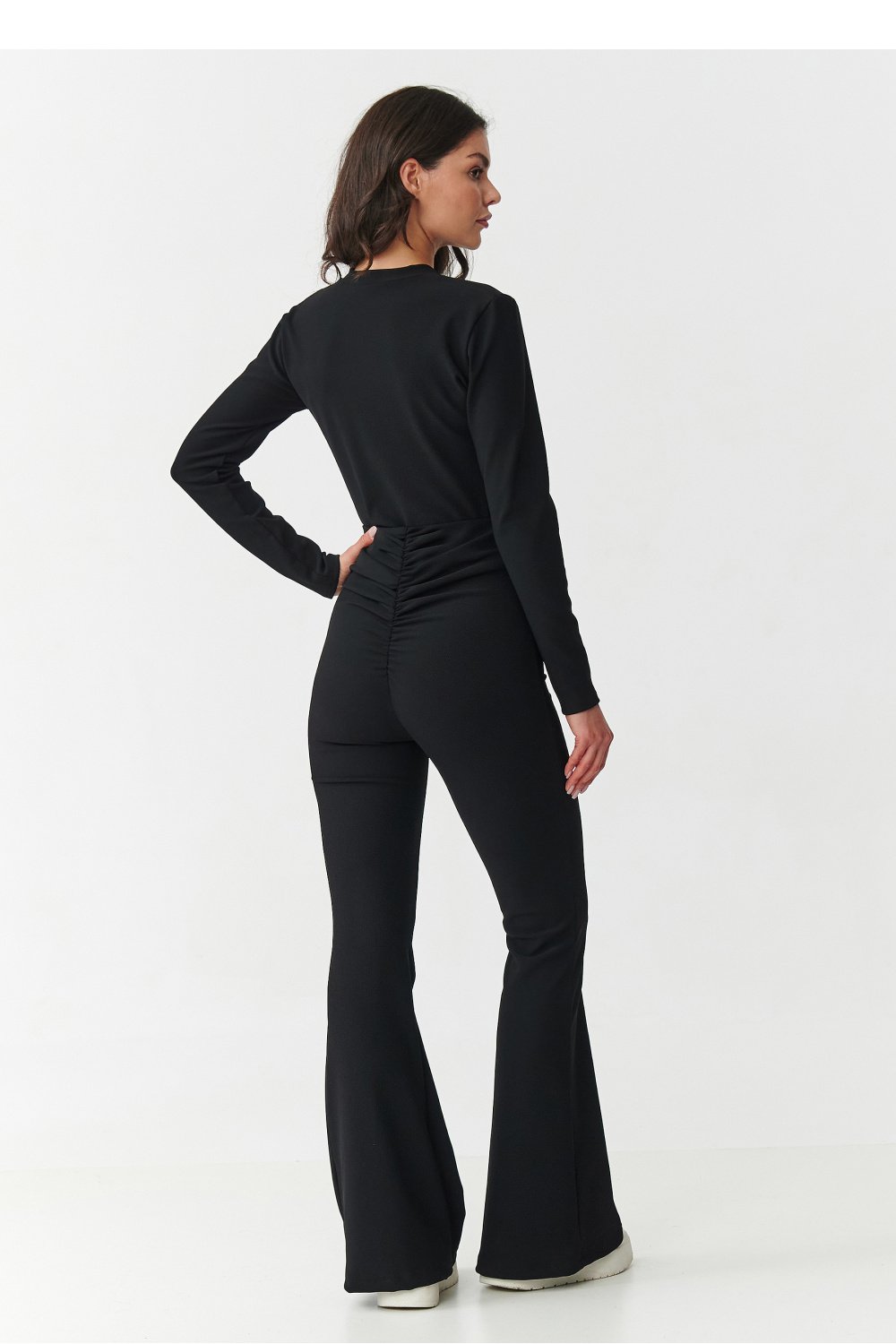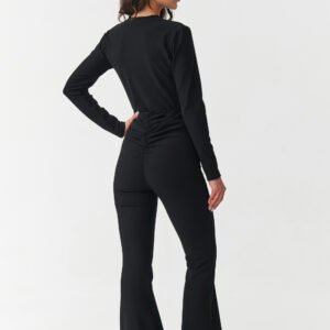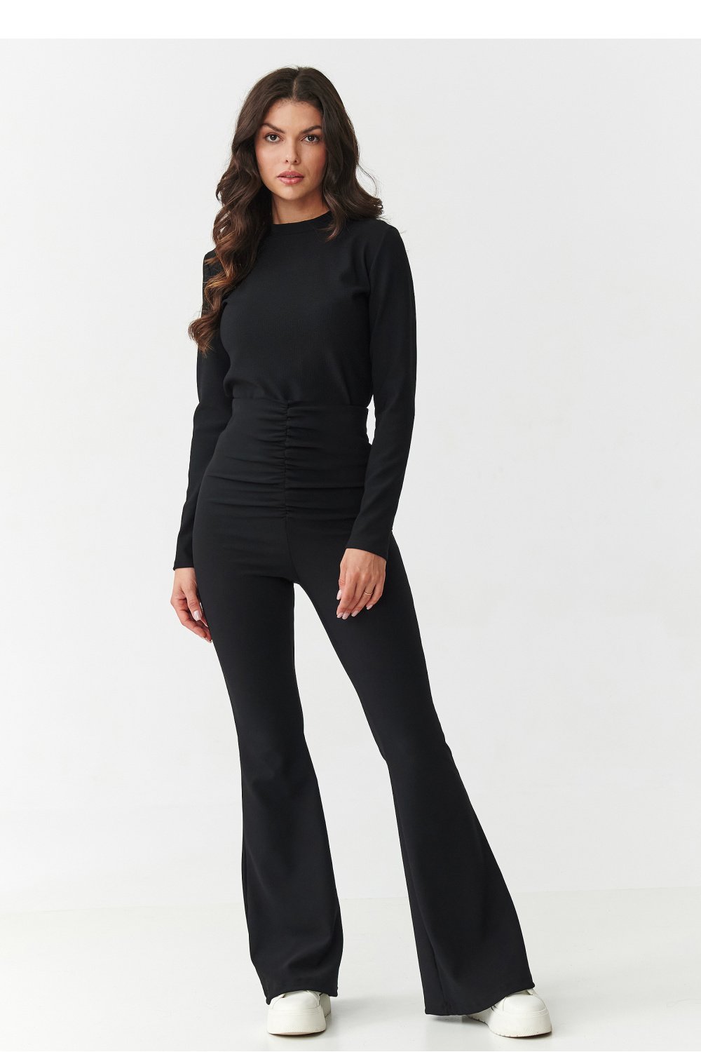 Postaw na look, który łączy w sobie elegancję i wygodę! Ten wyjątkowy komplet damski składa się z dopasowanej bluzki z długim rękawem oraz spodni z wysokim stanem i rozszerzanymi nogawkami. Wykonany z wysokiej jakości prążkowanego materiału pięknie podkreśla sylwetkę i zapewnia komfort noszenia przez cały dzień. Bluzka ma klasyczny krój z zabudowanym dekoltem i zapinana jest z tyłu na zamek, co czyni ją wygodną i jednocześnie bardzo szykowaną. Spodnie z wysokim stanem, podkreślają talię i modelują figurę a dzięki marszczeniu w pasie nadają sylwetce proporcji natomiast rozszerzane nogawki typu flare optycznie wydłużają nogi. Dostępny w czterech ponadczasowych kolorach: bordowy kobiecy i zmysłowy, czarny klasyk pasujący do wszystkiego, czekoladowy nowoczesny i wyrazisty, beżowy elegancki i subtelny. To komplet, który sprawdzi się na wiele okazji od wieczornych spotkań, przez uroczyste wyjścia, aż po biznesowe stylizacje. Wystarczy dodać ulubione buty na obcasie i biżuterię, aby stworzyć efektowny i nowoczesny look.