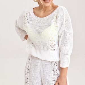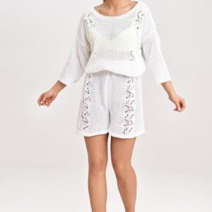 Komplet dwuczęściowy składający się z bluzki oraz krótkich spodenek. Bluzka ozdobiona z przodu wstawkami z dzianiny. Bluzka z rękawem 3/4 oraz okrągłym dekoltem. Krótkie spodenki z ażurowymi wstawkami.