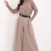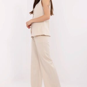 Elegancki komplet damski składający się z kamizelki i spodni, idealny na wizytowe okazje, do pracy lub na imprezę. Wykonany z wysokiej jakości poliestru i elastanu, materiał ten zapewnia wygodę i trwałość, a jednocześnie nadaje całości subtelną elegancję. Komplet doskonale łączy komfort z profesjonalnym stylem, sprawiając, że jest to idealny wybór na bardziej formalne wyjścia. Kamizelka z dekoltem w serek, zapinana na guziki, doskonale komponuje się z szerokimi, długimi nogawkami spodni o wysokim stanie. Spodnie mają boczne wsuwane kieszenie, które dodają praktyczności i nowoczesnego charakteru. Gładki wzór sprawia, że komplet jest ponadczasowy i bardzo uniwersalny. Idealny na eleganckie spotkania, do biura lub na wieczorne wyjścia, zapewniając wygodę i szyk w każdej sytuacji.
