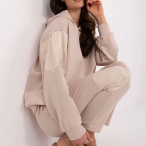 Komplet dresowy damski to idealne połączenie wygody i stylu na co dzień. Składa się z bluzy z kapturem oraz spodni z wysokim stanem, które doskonale dopasowują się do sylwetki. W pasie znajduje się praktyczne wiązanie, umożliwiające regulację obwodu. Zarówno bluza, jak i spodnie mają prosty, minimalistyczny krój, który sprawdzi się w casualowych stylizacjach. Długie nogawki oraz rękawy zapewniają komfort noszenia, a boczne wsuwane kieszenie dodają funkcjonalności. Wykonany z mieszanki poliestru, bawełny i elastanu materiał jest miękki, przyjemny w dotyku i dobrze układa się na ciele. Gładki wzór urozmaicają subtelne naszywki w kształcie serca umieszczone na rękawach oraz nogawkach, nadając całości wyjątkowego charakteru. To doskonały wybór na codzienne aktywności, relaks w domu czy spacer.