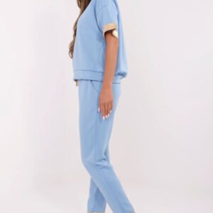 Stylowy i wygodny komplet damski, idealny na co dzień. Wykonany z wysokiej jakości mieszanki wiskozy, bawełny i elastanu, zapewnia komfort noszenia oraz swobodę ruchów. Gładki materiał nadaje mu eleganckiego minimalizmu, a złote wykończenia na nogawkach, rękawach i dekolcie dodają subtelnego szyku. Bluzka ma krótki rękaw oraz klasyczny okrągły dekolt, natomiast spodnie z wysokim stanem i wsuwanymi bocznymi kieszeniami zapewniają wygodę i praktyczność. Długie nogawki wykończone ściągaczami podkreślają casualowy charakter zestawu. Idealny wybór dla kobiet ceniących styl i wygodę w codziennych stylizacjach.
