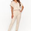 Lekki i przewiewny damski komplet uszyty z delikatnej dzianiny odmieni Twoje podejście do wygody. Bluzka z dekoltem w serek, wyposażona w rozkloszowane rękawy ozdobione elegancką blaszką. Swobodny fason bluzki zapewnia wygodę podczas noszenia, a luźne szorty z bocznymi kieszeniami dodają luźnego i sportowego stylu. Ten komplet doskonale sprawdzi się na co dzień, jest idealny zarówno do aktywności sportowej, spotkań ze znajomymi, jak i do pracy. Dostępny w kilku kolorach, oferuje różnorodność, pozwalającą dostosować go do gustu każdej kobiety. Styl, wygoda i nowoczesność, wszystko, czego potrzebujesz w jednym komplecie.
