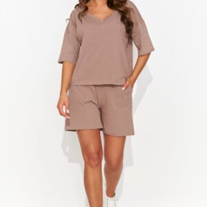 Lekki i przewiewny damski komplet uszyty z delikatnej dzianiny odmieni Twoje podejście do wygody. Bluzka z dekoltem w serek, wyposażona w rozkloszowane rękawy ozdobione elegancką blaszką. Swobodny fason bluzki zapewnia wygodę podczas noszenia, a luźne szorty z bocznymi kieszeniami dodają luźnego i sportowego stylu. Ten komplet doskonale sprawdzi się na co dzień, jest idealny zarówno do aktywności sportowej, spotkań ze znajomymi, jak i do pracy. Dostępny w kilku kolorach, oferuje różnorodność, pozwalającą dostosować go do gustu każdej kobiety. Styl, wygoda i nowoczesność, wszystko, czego potrzebujesz w jednym komplecie.