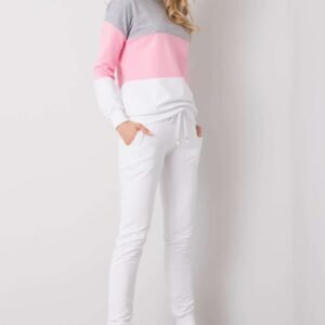Komplet dresowy składający się z bluzy i spodni. Bluza z długim rękawem oraz okrągłym dekoltem. Bluza wykonana z tkaniny w trzech kolorach. Długie spodnie z gumką w pasie, troczkami do wiązania oraz kieszeniami wsuwanymi.