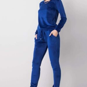 Welurowy komplet składający się z bluzy oraz spodni. Bluza z długim rękawem oraz okrągłym dekoltem. Długie spodnie z wiązaniem w pasie oraz kieszeniami wsuwanymi.