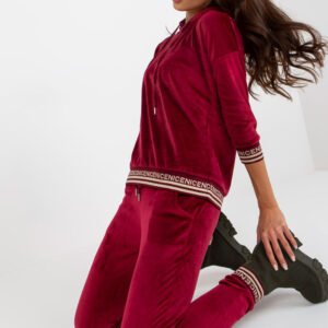 Komplet welurowy damski składający się z bluzy oraz spodni. Bluza z rękawem 3/4 oraz kapturem. Długie spodnie z wiązaniem w pasie oraz kieszeniami wsuwanymi. Komplet wykończony ściągaczami z ozdobnym nadrukiem.