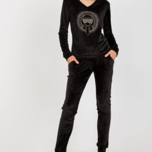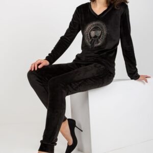 Welurowy komplety składający się z bluzy oraz spodni. Bluza z długim rękawem oraz dekoltem w serek. Długie spodnie z wiązaniem w pasie oraz kieszeniami wsuwanymi.