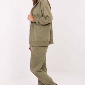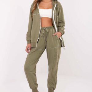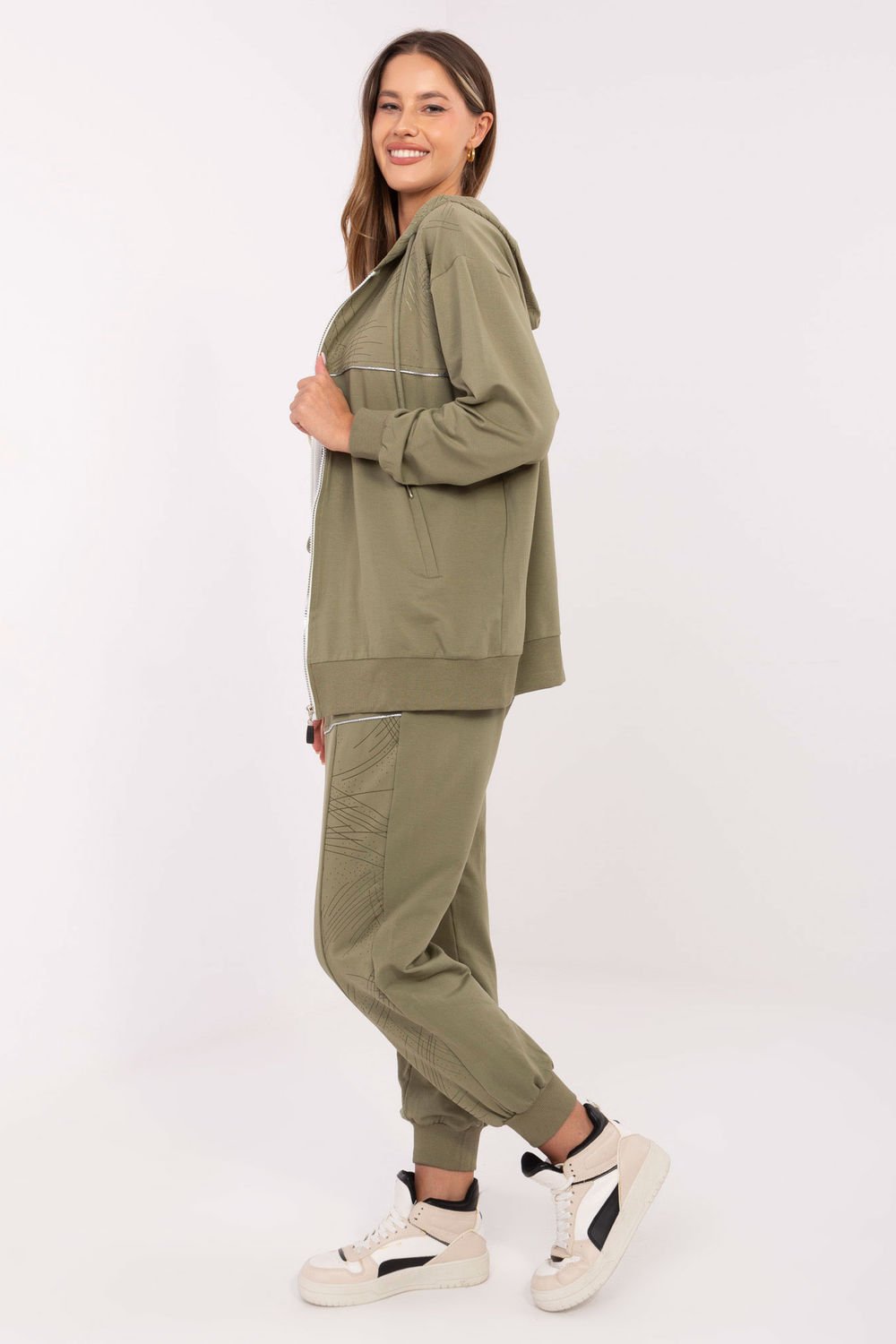 Komplet dresowy damski w stylu casual, idealny na codzienne okazje. Uszyty z bawełny z dodatkiem elastanu, zapewnia komfort noszenia i swobodę ruchów. Bluza zapinana na zamek posiada praktyczny kaptur oraz wsuwane kieszenie, a subtelny nadruk dodaje całości modnego charakteru. Spodnie o długich nogawkach zakończonych ściągaczami mają wysoki stan i regulację w pasie na wiązanie, co gwarantuje idealne dopasowanie. Boczne kieszenie wsuwane sprawiają, że komplet jest nie tylko wygodny, ale i funkcjonalny. To doskonały wybór dla kobiet, które cenią styl i wygodę w jednym.