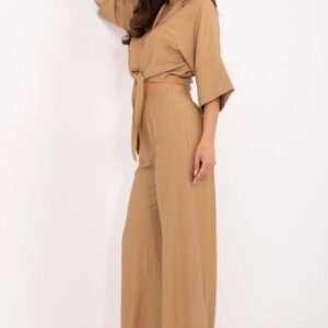 Stylowy i wygodny komplet damski, idealny na co dzień. Wykonany z przewiewnej mieszanki wiskozy i nylonu, zapewnia komfort noszenia oraz lekkość, idealną na cieplejsze dni. Koszula zapinana na guziki została wyposażona w wiązanie u dołu, które pozwala na regulację długości i dodaje całości swobodnego charakteru. W pasie znajduje się elastyczna guma, która podkreśla talię i zapewnia idealne dopasowanie. Koszula posiada klasyczny kołnierzyk, rękawy 3/4 oraz kieszonkę na piersi, co łączy casualowy styl z funkcjonalnością. Spodnie z wysokim stanem mają szerokie nogawki o długości do kostek, co gwarantuje modny wygląd i swobodę ruchu. Brak kieszeni w spodniach nadaje całości czysty, minimalistyczny wygląd. Dominujący gładki wzór i stonowany styl sprawiają, że komplet doskonale sprawdzi się w codziennych stylizacjach, zarówno do pracy, jak i na luźniejsze wyjścia.