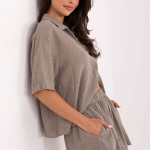 Stylowy i wygodny komplet damski, który świetnie sprawdzi się w codziennych, letnich stylizacjach. Wykonany z naturalnej, przewiewnej bawełny, zapewnia komfort noszenia i swobodę ruchów przez cały dzień. Zestaw składa się z koszuli zapinanej na guziki, z klasycznym kołnierzykiem i krótkim rękawem, idealnej zarówno do noszenia luzem, jak i wpuszczonej w spodenki. Do kompletu dołączone są szorty o szerokich nogawkach, z wysokim stanem i wsuwanymi kieszeniami po bokach, które dodają funkcjonalności i podkreślają swobodny charakter zestawu. Gładki materiał oraz luźny fason sprawiają, że komplet prezentuje się lekko i stylowo, a jednocześnie pozwala czuć się swobodnie. Doskonały wybór na spacery, wyjazdy, spotkania z przyjaciółmi czy codzienne aktywności w ciepłe dni.
