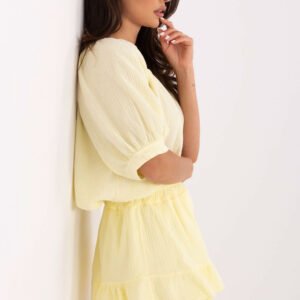 Lekki i przewiewny komplet wykonany z naturalnej bawełny muślinowej, idealny na ciepłe dni. Składa się z koszuli zapinanej na guziki oraz szortów z falbanami imitującą spódniczkę całość tworzy spójną, casualową stylizację na co dzień. Koszula ma luźny krój, krótki rękaw i okrągły dekolt, co zapewnia swobodę ruchów i lekkość stylu. Szorty mają szerokie nogawki oraz wysoki stan z elastyczną gumką w pasie, co gwarantuje komfort noszenia i świetne dopasowanie do sylwetki. Delikatne falbany dodają dziewczęcego uroku i lekkości całej stylizacji. Gładka faktura materiału podkreśla naturalny, minimalistyczny charakter zestawu, który doskonale sprawdzi się na spacery, zakupy, spotkania ze znajomymi czy wakacyjny wyjazd. To must-have w letniej, codziennej garderobie.