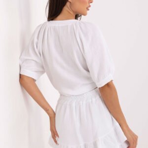 Lekki i przewiewny komplet wykonany z naturalnej bawełny muślinowej, idealny na ciepłe dni. Składa się z koszuli zapinanej na guziki oraz szortów z falbanami imitującą spódniczkę całość tworzy spójną, casualową stylizację na co dzień. Koszula ma luźny krój, krótki rękaw i okrągły dekolt, co zapewnia swobodę ruchów i lekkość stylu. Szorty mają szerokie nogawki oraz wysoki stan z elastyczną gumką w pasie, co gwarantuje komfort noszenia i świetne dopasowanie do sylwetki. Delikatne falbany dodają dziewczęcego uroku i lekkości całej stylizacji. Gładka faktura materiału podkreśla naturalny, minimalistyczny charakter zestawu, który doskonale sprawdzi się na spacery, zakupy, spotkania ze znajomymi czy wakacyjny wyjazd. To must-have w letniej, codziennej garderobie.