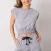 Komplet letni składający się z bluzy oraz spodni. Bluza z krótkim rękawkiem oraz okrągłym dekoltem. Długie spodnie z wysokim stanem, wiązaniem w pasie oraz kieszeniami wsuwanymi.