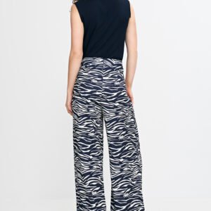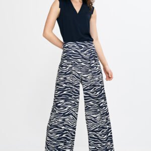 Stylowe damskie spodnie o regularnym kroju i wysokim stanie. Ozdobne zakładki z przodu dodają elegancji i subtelnie modelują sylwetkę. Szerokie, długie nogawki typu palazzo nadają lekkości i efektownego wyglądu. Z tyłu zapinane na dyskretny suwak, zapewniają wygodę i idealne dopasowanie. Doskonałe zarówno do codziennych, jak i bardziej formalnych stylizacji.