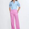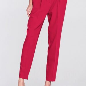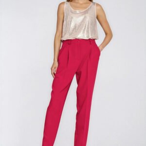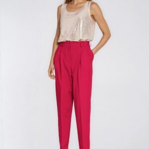 Spodnie damskie o regularnym kroju, łączące wygodę z modnym fasonem. Model z wysokim stanem pięknie podkreśla talię i zapewnia komfort noszenia. W pasie, w tylnej części, zastosowano elastyczną gumę, która ułatwia dopasowanie do sylwetki. Nogawki typu balloon, stopniowo zwężane ku dołowi, nadają całości nowoczesnego i stylowego charakteru. Spodnie zapinane na suwak i guzik, z przodu wyposażone w praktyczne kieszenie oraz szlufki umożliwiające noszenie paska. Doskonałe zarówno do codziennych, jak i bardziej eleganckich stylizacji.