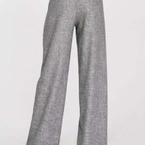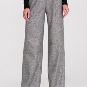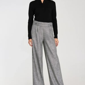 Stylowe spodnie damskie o kroju relaxed fit wykonane z materiału o melanżowej fakturze i niejednolitym kolorze, który nadaje im nowoczesnego charakteru. Model posiada wysoki stan oraz ozdobne zakładki z przodu, subtelnie podkreślające sylwetkę. Nogawki wide leg są szerokie i długie, co zapewnia komfort i swobodę ruchu. Spodnie mają klasyczne kieszenie z przodu, a tylna część pasa wyposażona jest w gumę, która dopasowuje spodnie do sylwetki. Dodatkowym detalem jest szeroki pas z ozdobnymi guzikami, nadający całości eleganckiego, modowego charakteru.