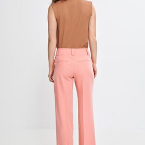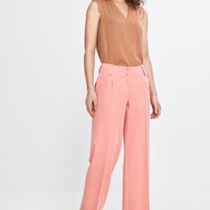 Stylowe spodnie damskie o regularnym kroju i średnim stanie, łączące elegancję z nowoczesnym designem. Szeroka nogawka typu wide leg nadaje im lekkości, a zaprasowane kanty z przodu i z tyłu podkreślają ich ponadczasowy charakter. Zapięcie na suwak i dwa guziki zapewniają wygodę, a klasyczne kieszenie po bokach oraz imitacje kieszeni z tyłu dodają praktycznego akcentu. Szeroki pasek z szlufkami na pasek doskonale podkreśla talię, gwarantując idealne dopasowanie i komfort noszenia. Idealne do codziennych, jak i eleganckich stylizacji.
