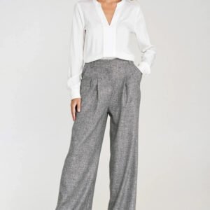 Eleganckie spodnie damskie o kroju relaxed fit wykonane z materiału o melanżowej fakturze i niejednolitym kolorze, który nadaje im nowoczesny, stylowy wygląd. Model posiada wysoki stan i ozdobne zakładki z przodu, które subtelnie podkreślają sylwetkę. Nogawki wide leg są szerokie i długie, zapewniając komfort i swobodę ruchu. Spodnie mają zapięcie z przodu na suwak i guzik, klasyczne kieszenie z przodu oraz imitacje kieszeni z tyłu. Szlufki na pasek pozwalają na dodatkowe dopasowanie stylizacji. Idealne do casualowych i eleganckich zestawów, łączą wygodę z modnym designem.