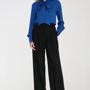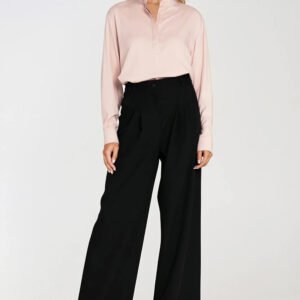 Eleganckie spodnie damskie o luźnym kroju relaxed fit i wysokim stanie, które pięknie podkreślają talię i optycznie wydłużają nogi. Model z ozdobnymi zakładkami z przodu oraz szerokimi, długimi nogawkami typu wide leg, nadającymi sylwetce lekkości i swobody. Spodnie posiadają zapięcie na suwak i guzik z przodu, klasyczne kieszenie po bokach oraz imitacje kieszeni z tyłu, co dodaje całości eleganckiego charakteru. Szlufki w pasie umożliwiają noszenie ulubionego paska i podkreślenie talii. Stylowy model, który sprawdzi się zarówno w stylizacjach biurowych, jak i w eleganckich zestawach na specjalne okazje.