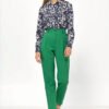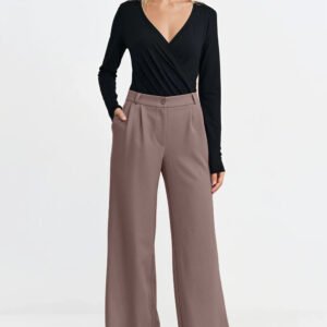 Stylowe spodnie damskie o kroju relaxed fit to idealne połączenie komfortu i elegancji. Posiadają średni stan, który pięknie podkreśla sylwetkę i zapewnia wygodę noszenia na co dzień. Z przodu zdobią je ozdobne zakładki, dodające całości subtelnej elegancji. Szeroka, swobodna nogawka typu wide leg nadaje spodniom nowoczesny charakter i optycznie wydłuża nogi. Model zapinany jest klasycznie na suwak i guzik, a całość uzupełniają funkcjonalne kieszenie z przodu oraz imitacje kieszeni z tyłu, które zachowują minimalistyczny, ponadczasowy wygląd. Dodatkowym atutem są szlufki w pasie, dzięki którym spodnie można nosić zarówno solo, jak i w komplecie z ulubionym paskiem.