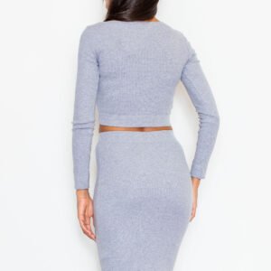 Rewelacyjny komplet damski, w skład którego wchodzi krótki top z długim rękawem oraz spódnica. Krótka góra uwodzicielsko odsłania brzuch, a kontrastowy wszyty na linii biustu pasek sprytnie podkreśla kobiece atuty. Spódnica midi, o klasycznym ołówkowym kształcie. Proponowany zestaw jest bardzo seksowny, prezentuje mocny charakter każdej stylizacji.