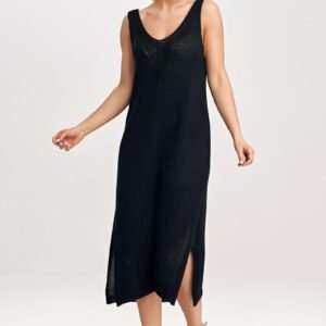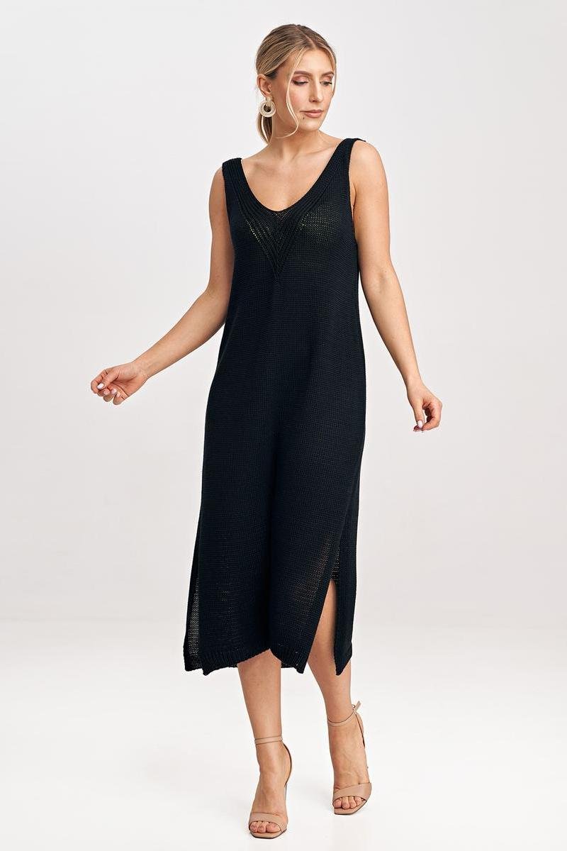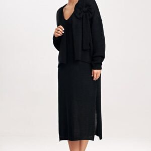 Komplet dwuczęściowy składający się z midi sukienki oraz bolerka. Bolerko z długim rękawem, niezapinane z ozdobną kokardą na przodzie. Sukienka na grubych ramiączkach oraz głębokim dekoltem.