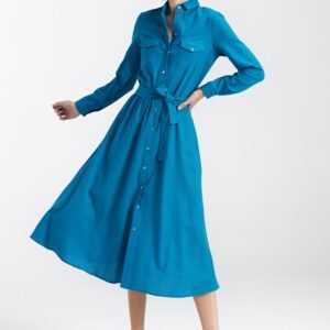 Sukienka o kroju regularnym to doskonała propozycja dla kobiet ceniących komfort i elegancję. Wykonana z wysokiej jakości materiałów, takich jak wiskoza, len i bawełna, gwarantuje przyjemne noszenie i zachowanie świetnego wyglądu na co dzień. Klasyczny kołnierzyk nadaje sukience ponadczasowego charakteru, podkreślając jednocześnie subtelność i klasykę. Długi rękaw z mankietem dodaje sukience elegancji, nadając jej uniwersalny charakter, który świetnie sprawdzi się w różnych okolicznościach. Zapięcie na srebrne napy jest nie tylko praktyczne, ale również stanowi delikatny element ozdobny, nadający sukience wyjątkowego uroku. Długość midi to modny wybór, który podkreśla kobiecą sylwetkę, jednocześnie pozostając odpowiednią zarówno na co dzień, jak i na bardziej formalne okazje. Sukienka posiada ozdobne kieszenie na wysokości piersi, co nadaje jej charakteru i oryginalności. Dodatkowe kieszenie w bocznych szwach sukienki są praktyczne i dodają jej swobodnego charakteru. W komplecie znajduje się stylowy pasek, który pozwala podkreślić talię, nadając sukience jeszcze bardziej korzystny wygląd. Sukienka nie posiada podszewki, co sprawia, że jest lekka i idealna na cieplejsze dni. To doskonała propozycja dla kobiet ceniących wygodę, elegancję i ponadczasowy styl.