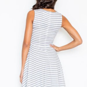 Letnia sukienka wykonana z delikatnej bawełny. Model w marynarskie pasy na szerokich ramiączkach. Góra dopasowana, dół sukienki rozkloszowany. Model zapinany z tyłu na kryty zamek. Dostępna w trzech oryginalnych wersjach kolorystycznych.