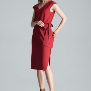 Bordowa sukienka midi z dekoltem w serek, w pasie wszyta gumka. Dodatkowy materiałowy, wiązany pasek. Na lewej nodze asymetryczne rozcięcie, bez podszewki.